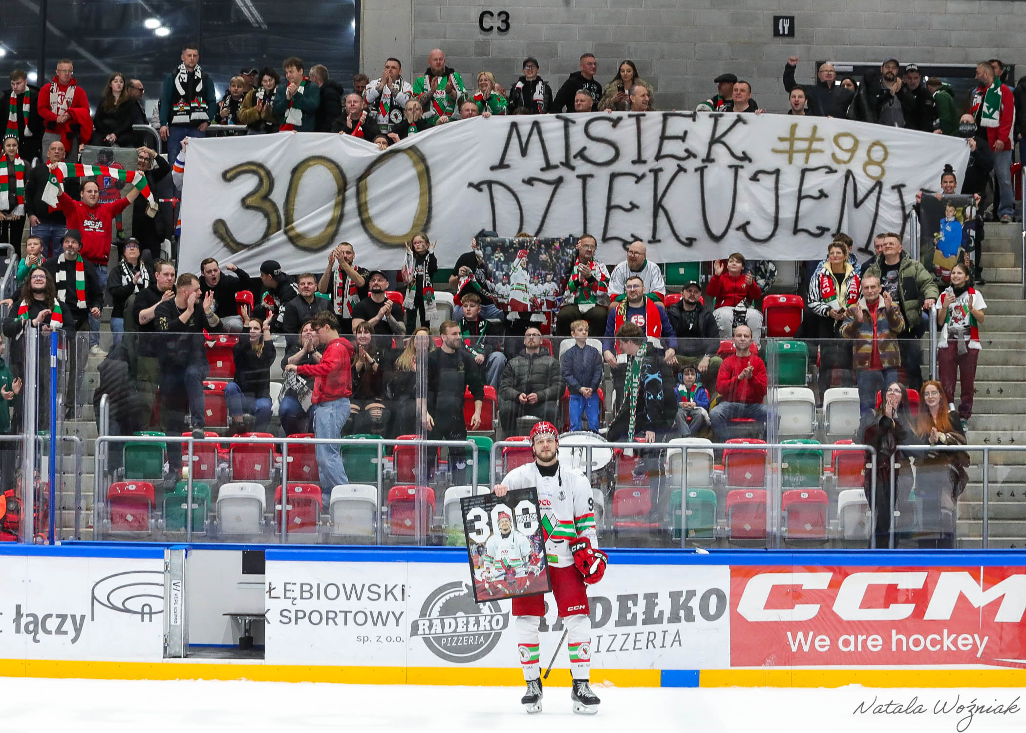 Nasz wychowanek – Michał Bernacki – po wczorajszym meczu miał dodatkowy powód do radości. Po pierwszej wygranej w ćwierćfinale nasz napastnik odebrał specjalny upominek gdyż ma na swoim koncie już 300 rozegranych spotkań na esktraligowych taflach. „Misiek” życzymy wielu kolejnych meczów i dziękujemy, że od najmłodszych lat jesteś razem z nami. Przypomnijmy, że Bernacki od początku swojej przygody z hokejem jest wierny tylko naszym barwom i przez te lata reprezentował tylko Zagłębie Sosnowiec. Dziękujemy!
