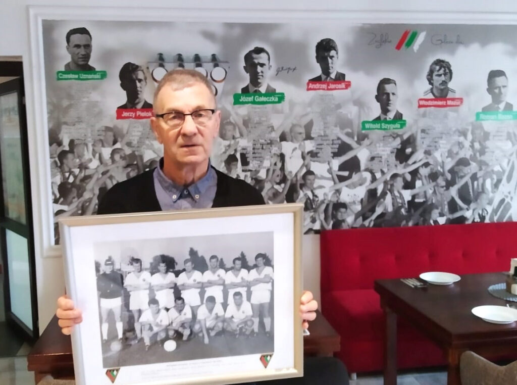 Na zdjęciu: Jerzy Pielok trzyma historyczne zdjęcie Zagłębia z 1965 roku, na którym znajdują się sami reprezentanci Polski w różnych kategoriach wiekowych.