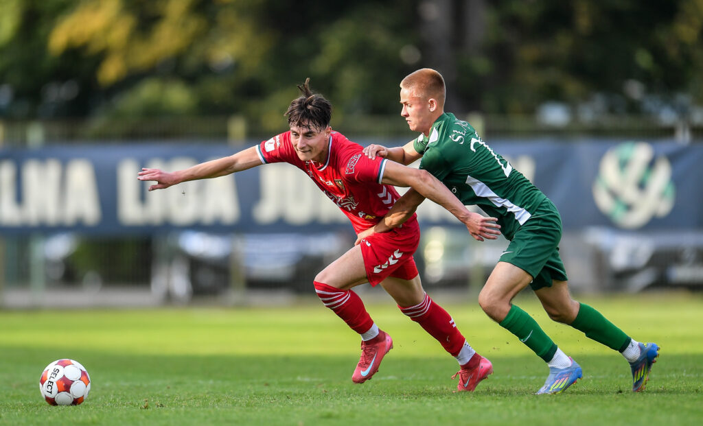 Na zdjęciu: Dawid Szot oraz Dawid Moskaluk podczas meczu Betclic 2. Liga sezon 2025/26 Śląsk II Wrocław – Zagłębie Sosnowiec (1:1). Foto: Mateusz Sobczak
