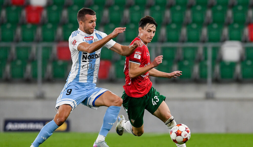Na zdjęciu: Krzysztof Ropski oraz Dawid Szot podczas meczu Betclic 2. Liga sezon 2025/26 Zagłębie Sosnowiec – Świt Szczecin (fot. Mateusz Sobczak)