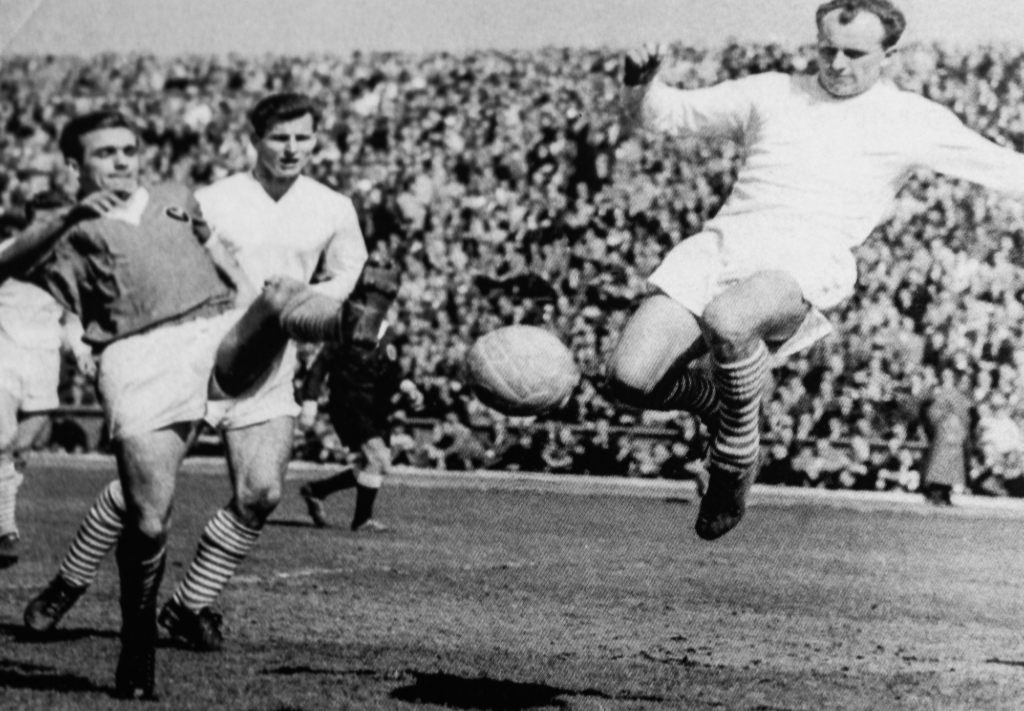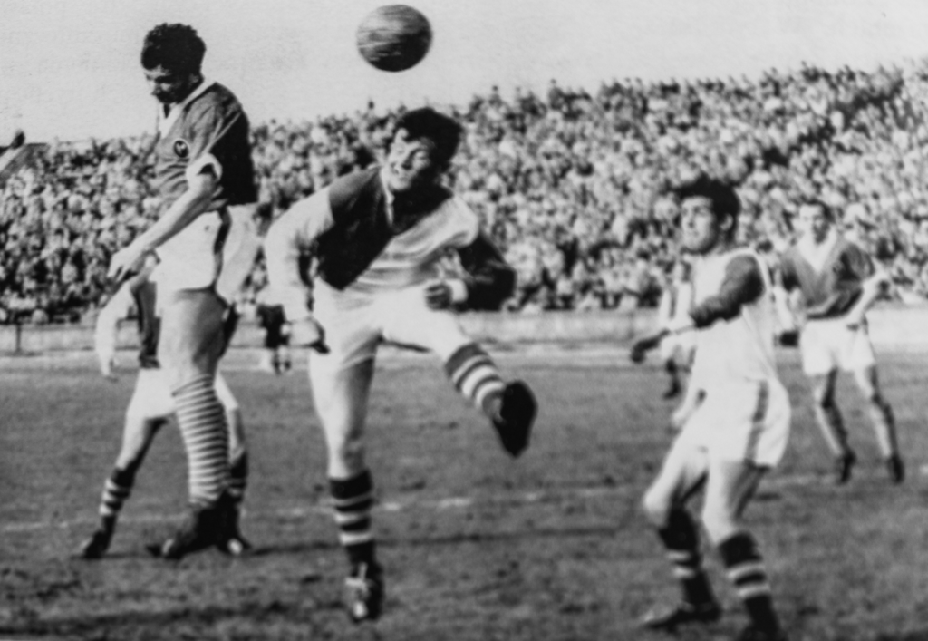 Na zdjęciu: Zagłębie – Stal Rzeszów 5:0 (3 V 1964). Eugeniusz Szmidt z lewej strzelił w tym meczu 2 gole. Fot. Zdzisław Kempa; udostępnił Mirosław Gołąb.