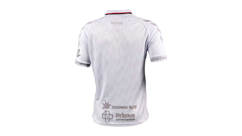 Biała baza symbolizuje dumę pokoleń kibiców, a stalowe wykończenia podkreślają siłę i charakter przypominając o hutniczych czasach naszej społeczności. Pattern stworzony z zagłębiowskiego trójzębu pokrywa przód i tył koszulki.