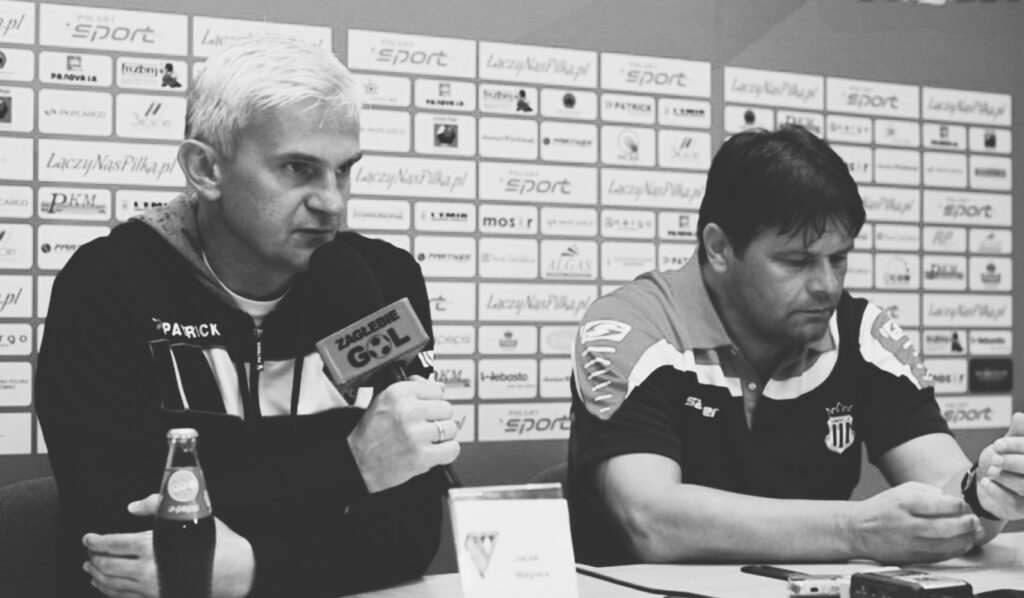 Na zdjęciu: Konferencja prasowa po meczu Zagłębie – Sandecja 2:0, 21 sierpnia 2016. Obok Jacka Magiery (z lewej), Radosław Mroczkowski (ówczesny trener Sandecji Nowy Sącz). Foto: Marcin Dziubek