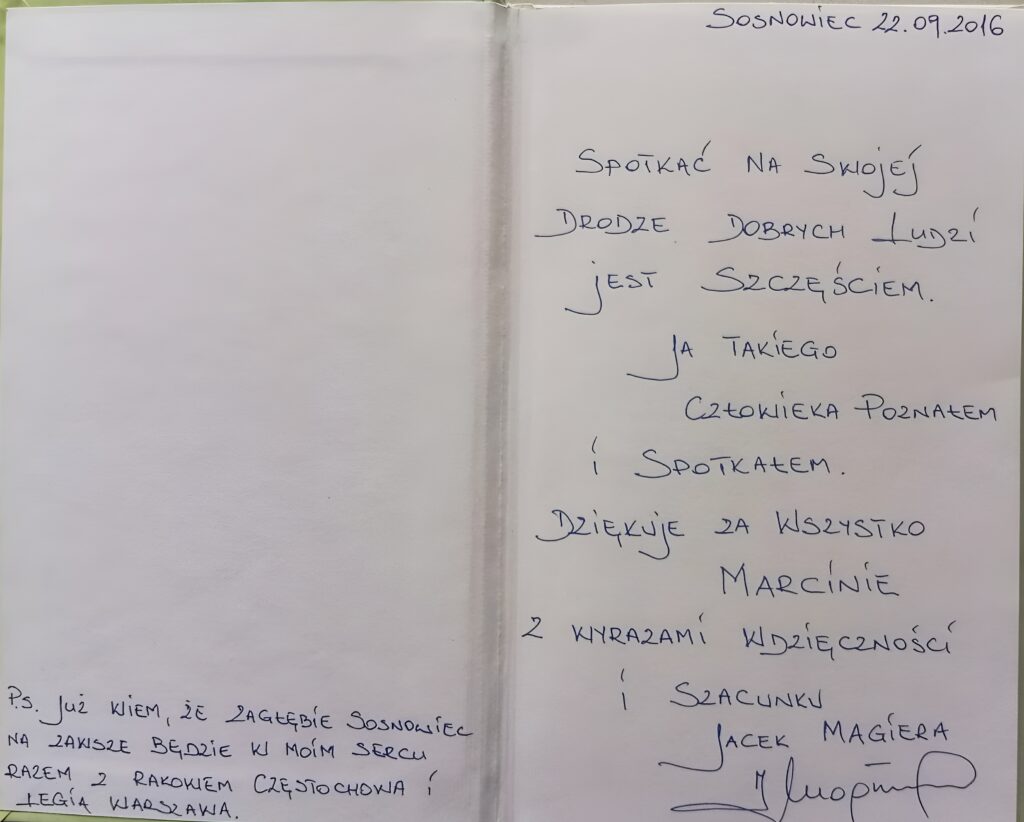 — „JUŻ WIEM, ŻE ZAGŁĘBIE SOSNOWIEC NA ZAWSZE BĘDZIE W MOIM SERCU RAZEM Z RAKOWEM CZĘSTOCHOWA I LEGIĄ WARSZAWA” — takie postscriptum w formie dedykacji napisał na książce „Szczęście czy fart”, którą podarował Marcinowi Jaroszewskiemu, prezesowi Zagłębia. Była to forma podziękowania i szacunku nie tylko dla piłkarzy, trenerów czy władz naszego Klubu, ale przede wszystkim dla naszych kibiców…
