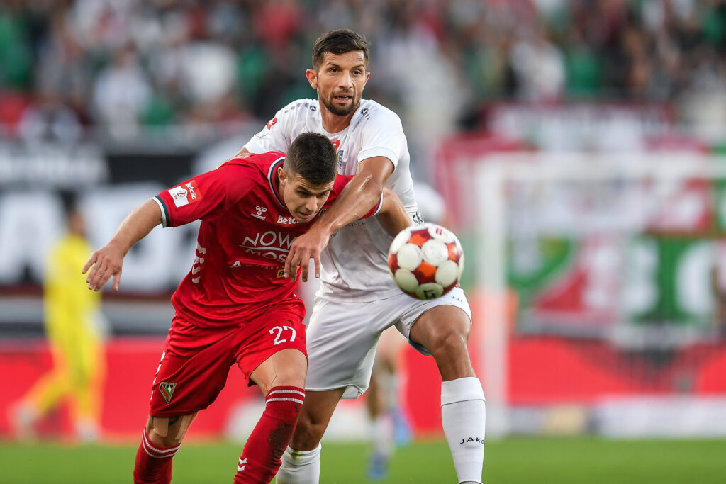 Na zdjęciu: Bartosz Boruń oraz Jonatan Straus podczas meczu Betclic 2. Liga sezon 2025/26 Zagłębie Sosnowiec – Unia Skierniewice (fot. Mateusz Sobczak)