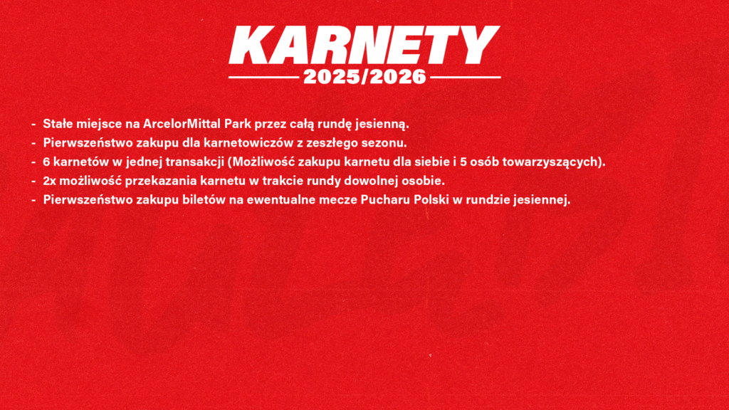 Przygotuj się na nowy sezon! W piątek (04.07, godz. 10:00) rusza zamknięta sprzedaż karnetów na sezon 2025/2026. Zapewnij sobie miejsce na trybunach ArcelorMittal Park już teraz!