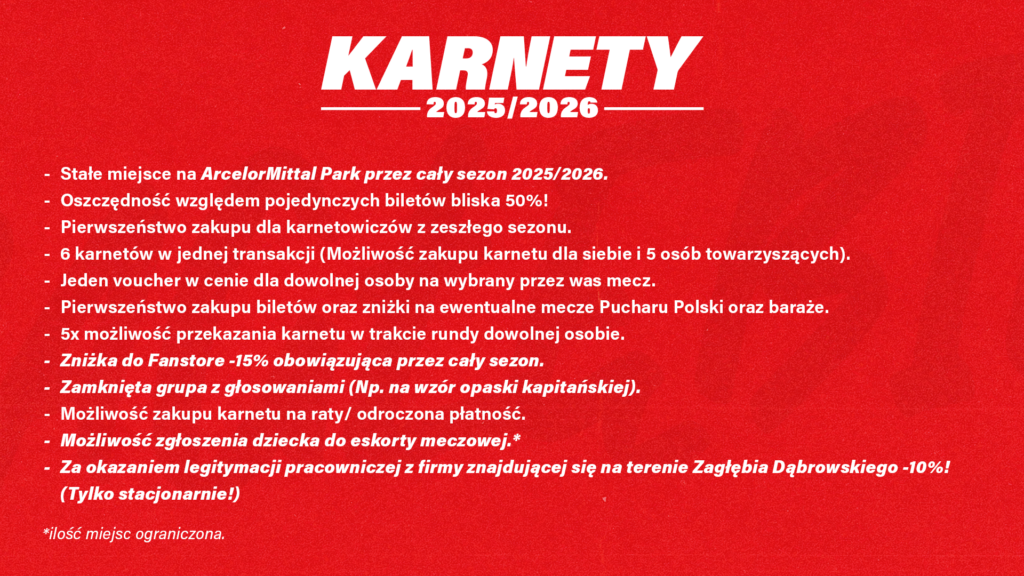 Karnety możecie nabyć „online” w naszej stronie biletowej oraz w FanStore Zagłębia Sosnowiec. Przypominamy, że sprzedaż zamknięta startuje w piątek (04.07.2025) o godzinie 10:00.